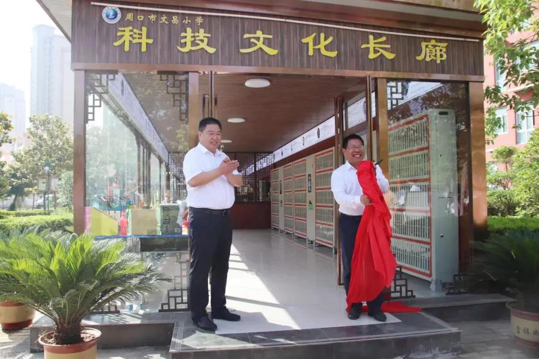 市教体局副局长朱鑫与文昌小学校长朱刚伟为学校新建的科技长廊揭幕并参观。