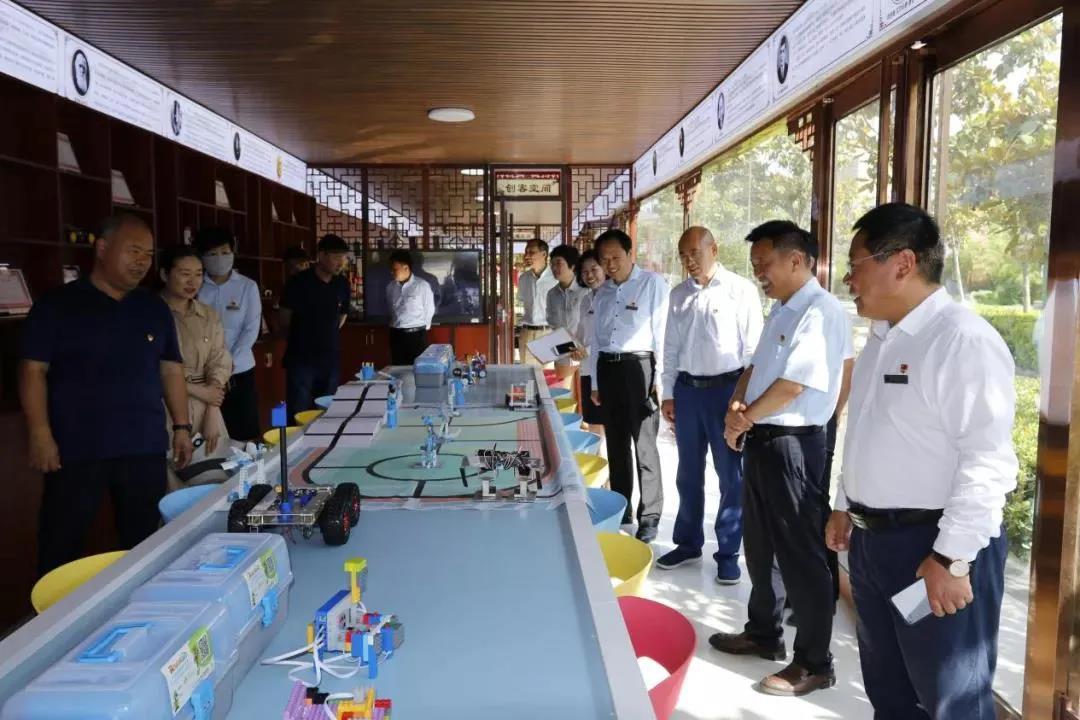在创客空间,与会人员观看机器人表演。创客空间开展了少儿编程和智能机器人兴趣班,参加学习的有400多人,在省教育厅举办的“青少年创新制作小发明”比赛中,该校有19人获奖,其中有4个一等奖;在周口市举办的少儿创意编程比赛中,该校获奖学生有71人。