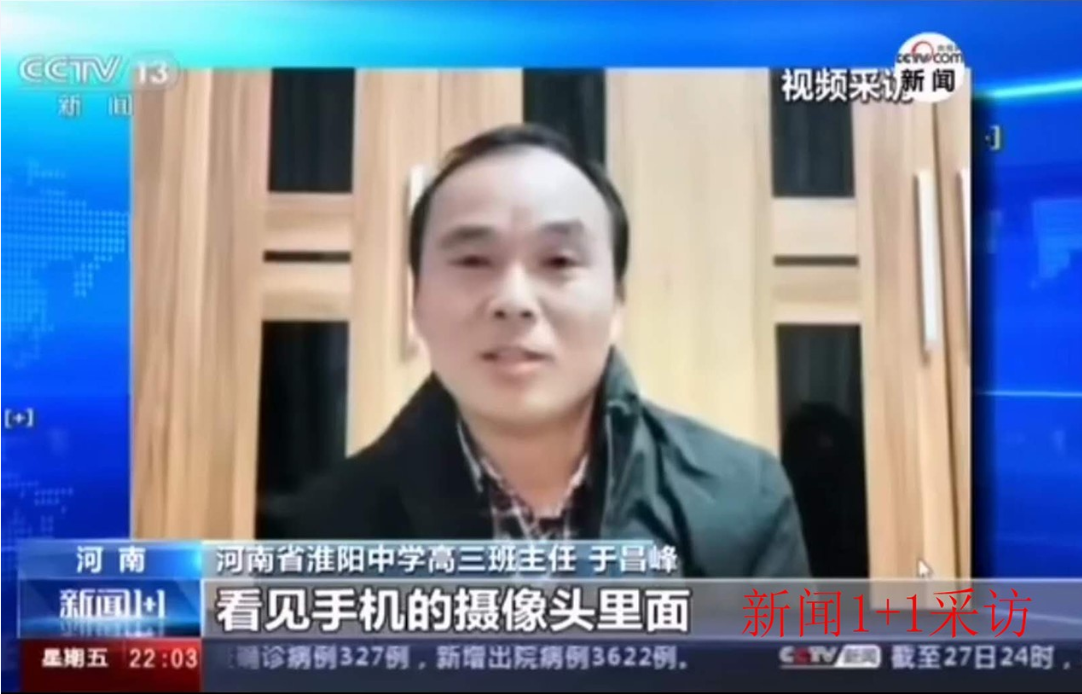 2月18日,和往常一样,于昌峰在家组织学生召开“众志成城做好疫情防控,凝心聚力搞好线上学习”主题班会,想起班内有的同学生于非典那年,高考又不幸赶上了新冠病毒肆虐,不得不宅在家里上网课。他担心学生前途,并担心网课效果不如在校学习的效果好,更担心疫情会对学生备战高考产生影响。多日积压在内心的压力再也抑制不住,情感激动。在直播中,他痛苦于不能和同学们面对面,眼泪不由自主流了下来。